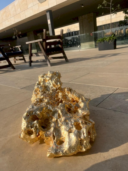 العمل الفني ككل غني ومتعدد الطبقات، مشبع بالرمزية والتساؤلات الفلسفية، وفي الوقت ذاته يتناغم مع إشارات جيولوجية دقيقة، فكل زاوية ينظر منها المتلقي إلى الحجر المُذهب تعكس له وجهًا مختلفًا، لتكون بمثابة مرآة لما يراه في ذاته.
